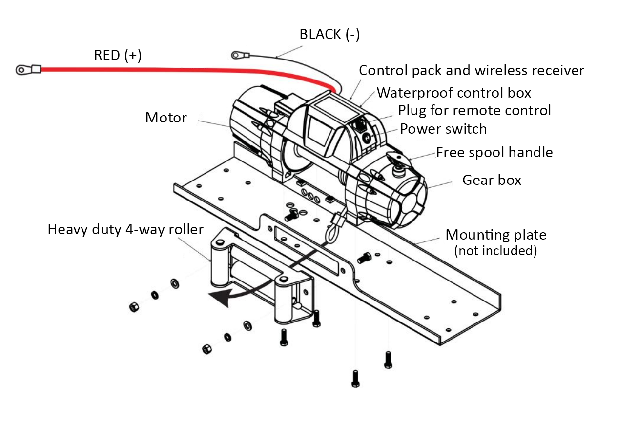 Le treuil fonctionne sur une alimentation 12 V CC et atteint sa force de traction maximale sur la première couche de corde. À mesure que le nombre de couches de corde sur le tambour augmente, la force de traction disponible diminue progressivement, ce qui est caractéristique de tous les treuils à tambour.