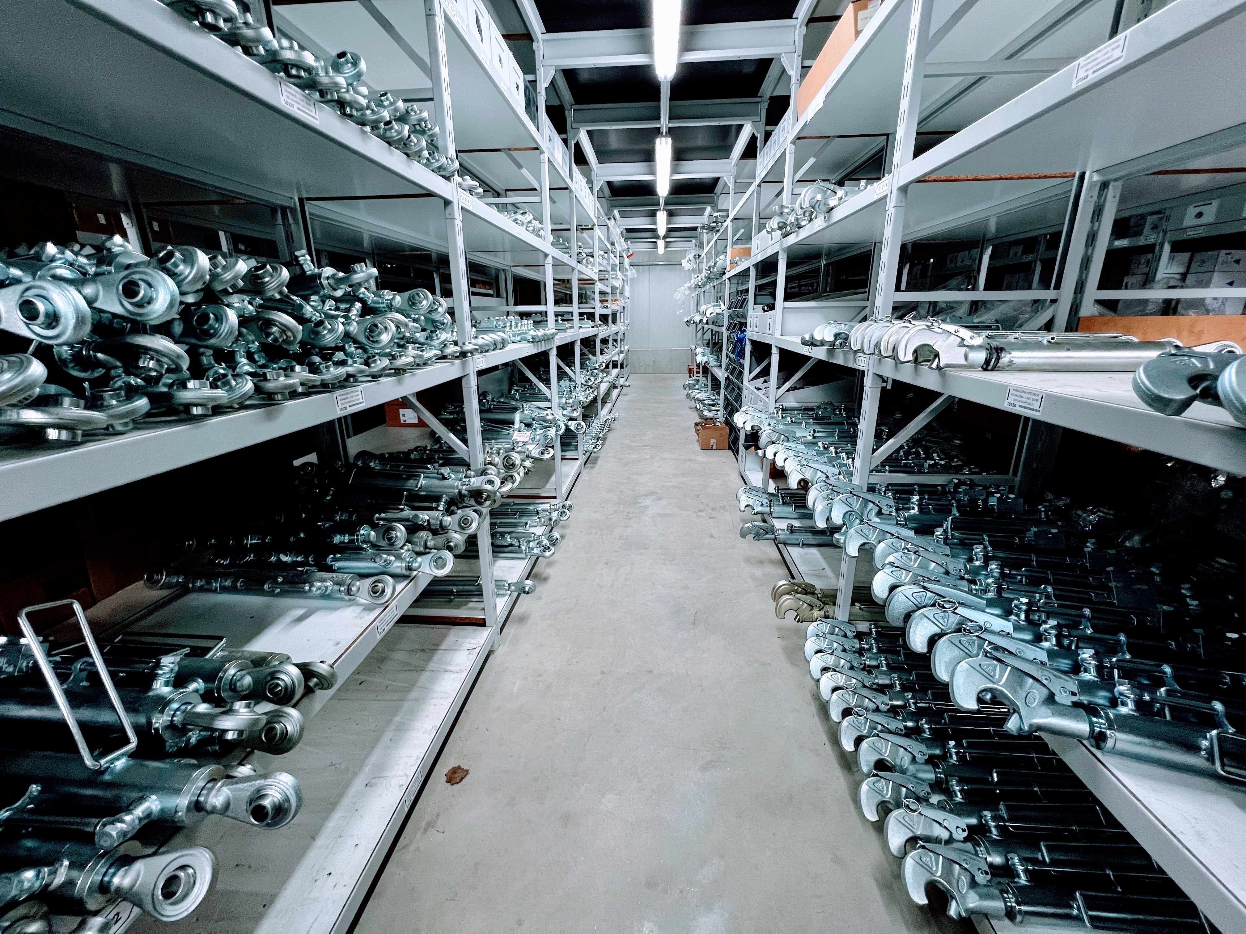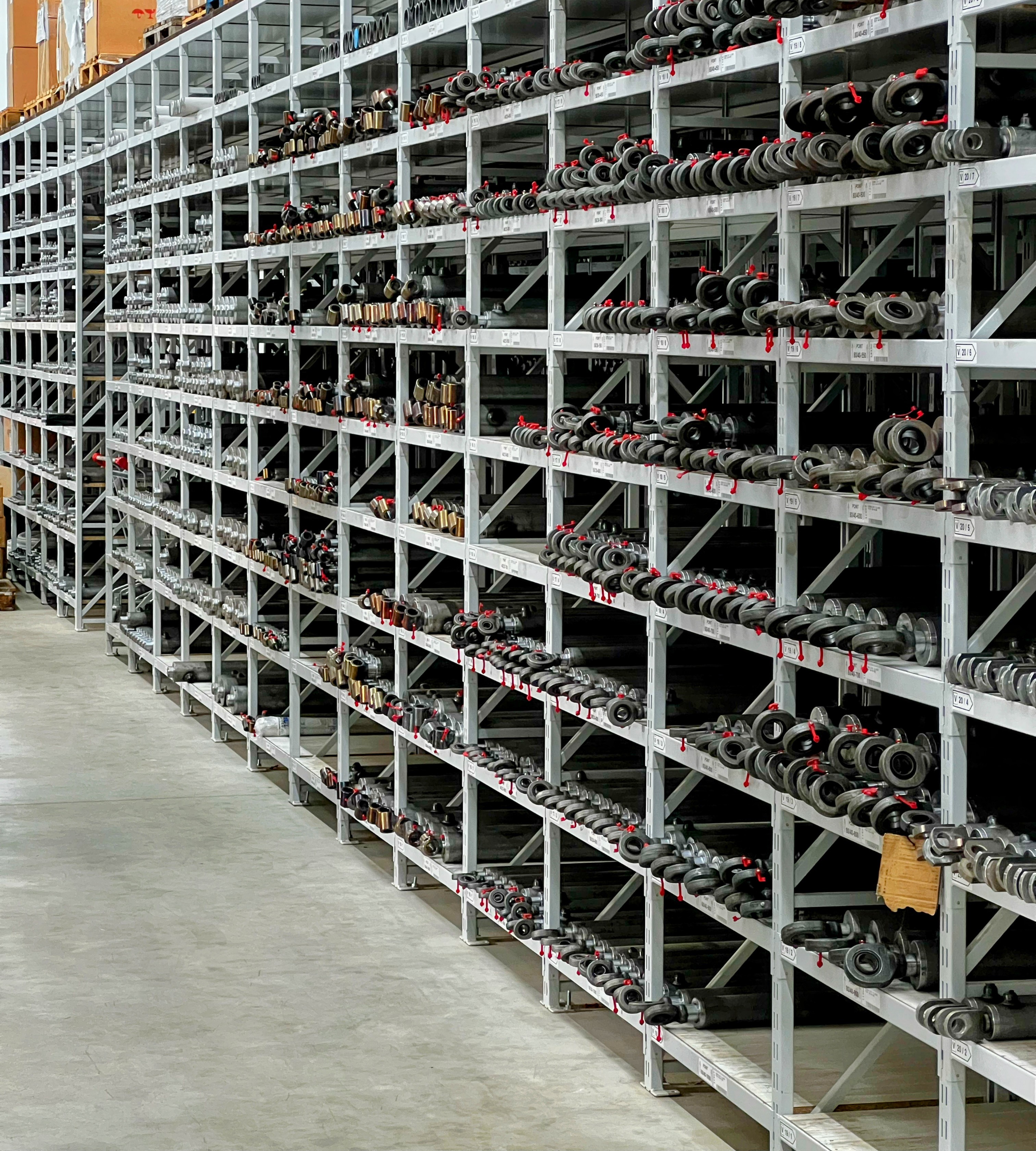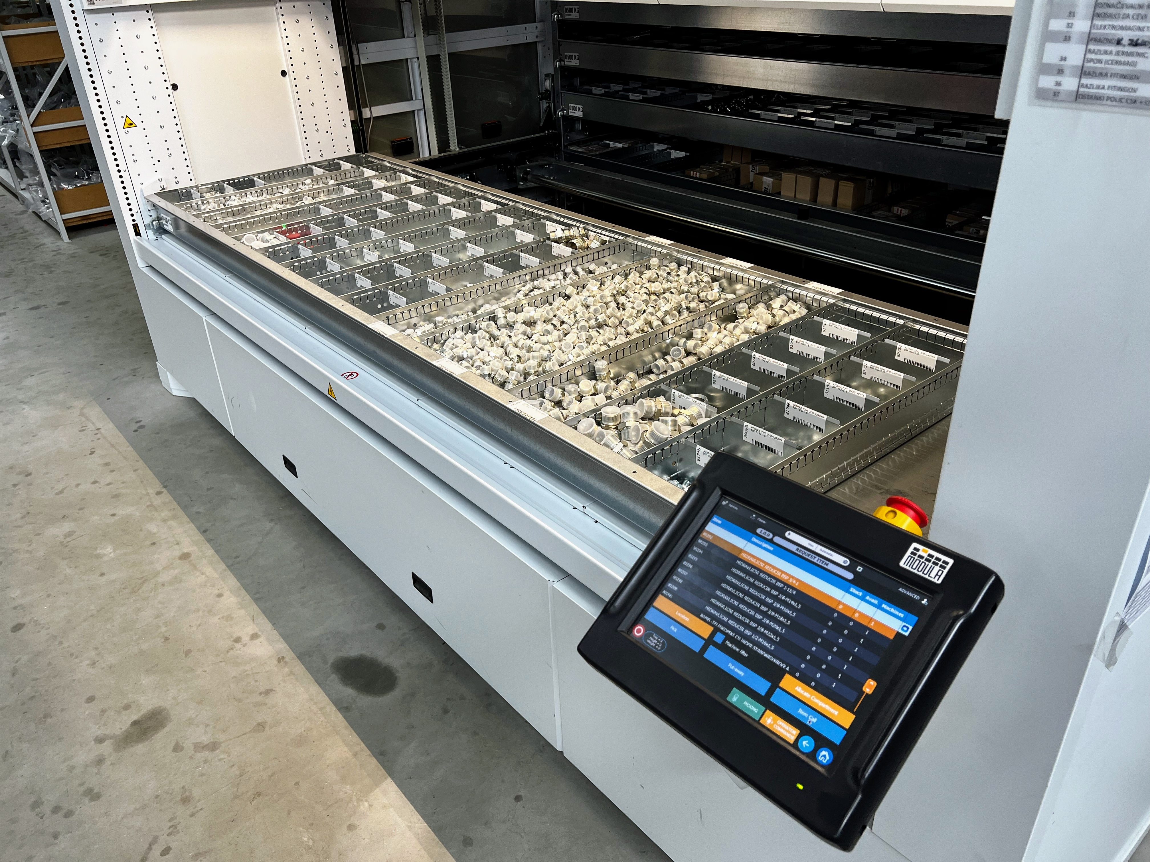 Pour les petites pièces, nous utilisons un « entrepôt intelligent » (Modula). Les articles sont organisés par code dans des plateaux à compartiments. En entrant un code sur l’écran, le système amène en quelques secondes le plateau correct et indique le compartiment avec un laser. Le système est intégré à l’inventaire, de sorte que les stocks sont toujours exacts. Cela est particulièrement utile pour les raccords, car nous assemblons chaque jour de nombreux flexibles hydrauliques personnalisés avec des connecteurs différents à chaque extrémité.