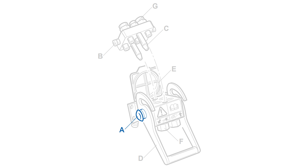 Bouton de sécurité d'origine pour les raccords rapides Multi-Faster. Le bouton verrouille mécaniquement le levier sur la partie fixe de la plaque, empêchant toute déconnexion accidentelle des conduites hydrauliques pendant le fonctionnement ou le transport. Pour déconnecter, il faut appuyer sur le bouton. Ne forcez jamais le levier sans avoir appuyé au préalable.