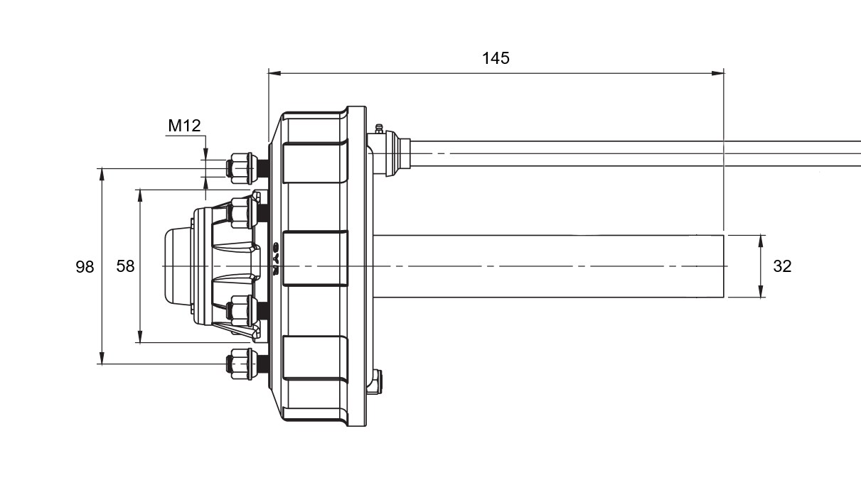 L'essieu fusée est destiné à être utilisé sur différents types de remorques avec un système de freinage. La longueur de l'essieu fusée est de 145 mm, avec une capacité de charge allant jusqu'à 450 kg.