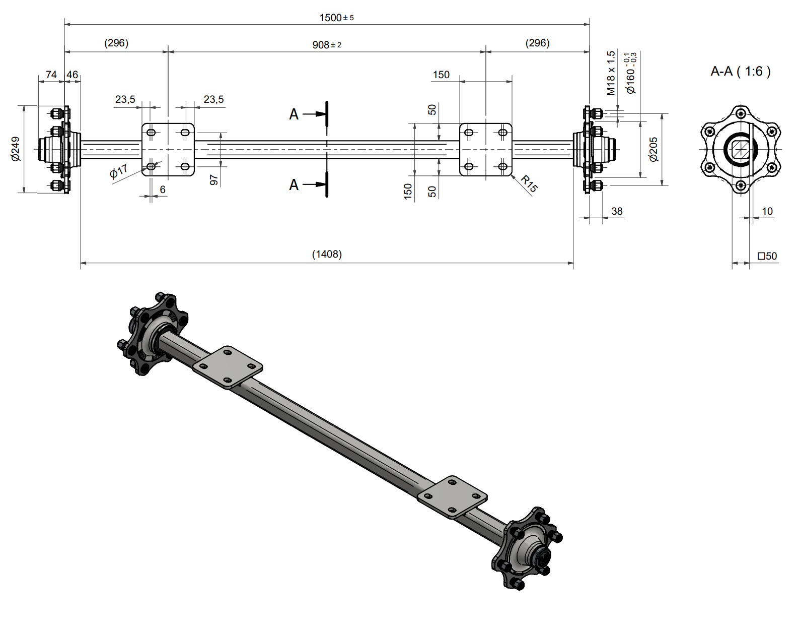 ESSIEU POUR REMORQUE SANS FREINS (6 VIS) - 3300 kg - 1500 mm (AVEC PLAQUE DE MONTAGE)