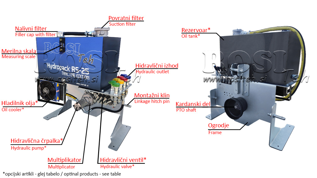 L'unité hydraulique de tracteur est une unité séparée qui nous permet de contrôler des accessoires sur des tracteurs qui ne génèrent pas suffisamment de débit ou de puissance hydraulique par eux-mêmes. L'unité hydraulique RS-25 génère un débit suffisant, permettant une utilisation polyvalente, une puissance suffisante et une fiabilité tout en maintenant la puissance sur le tracteur. Elle est utilisée pour diverses applications en viticulture, foresterie, agriculture (topping, fendeurs, souffleuses à neige, chargeurs, tondeuses, balayeuses, épandeurs, …)
