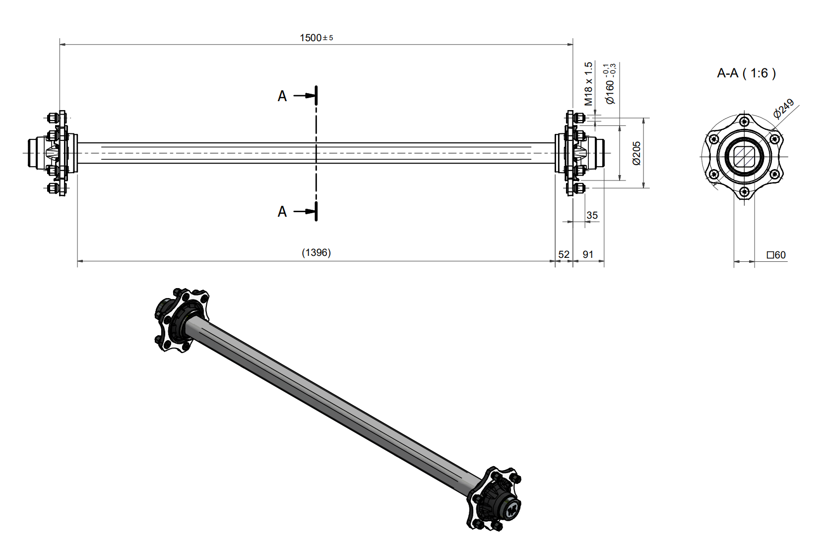OSOVINA ZA PRIKOLICO 4800 kg BREZ ZAVOR (1500 mm)