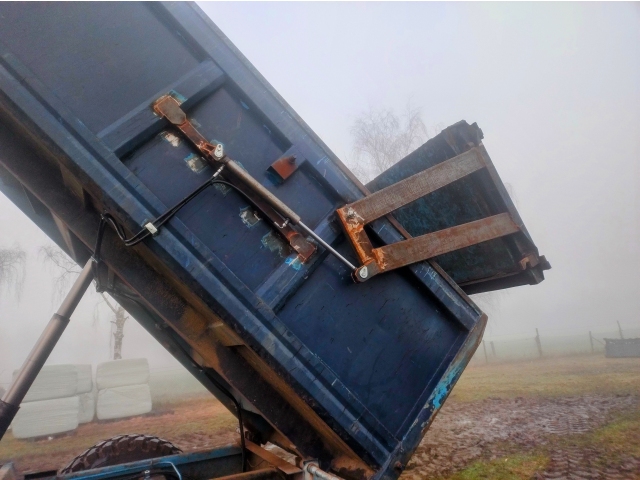 Stranka iz Belgije je imela prej na svoji traktorski prikolici le mehansko odpiranje zadnje stranice na prikolici. Zaradi večjega obsega dela je bilo odpiranje kar zamudno, zato je stranka predelala odpiranje na hidravlično. Potrebne so bile določene ojačitve in pa povezava obeh hidravličnih cilindrov s komandami v traktorski kabini. Stranka lahko sedaj odpira stranico prikolice kar iz kabine in ne rabi iti vedno ven pred kipanjem.