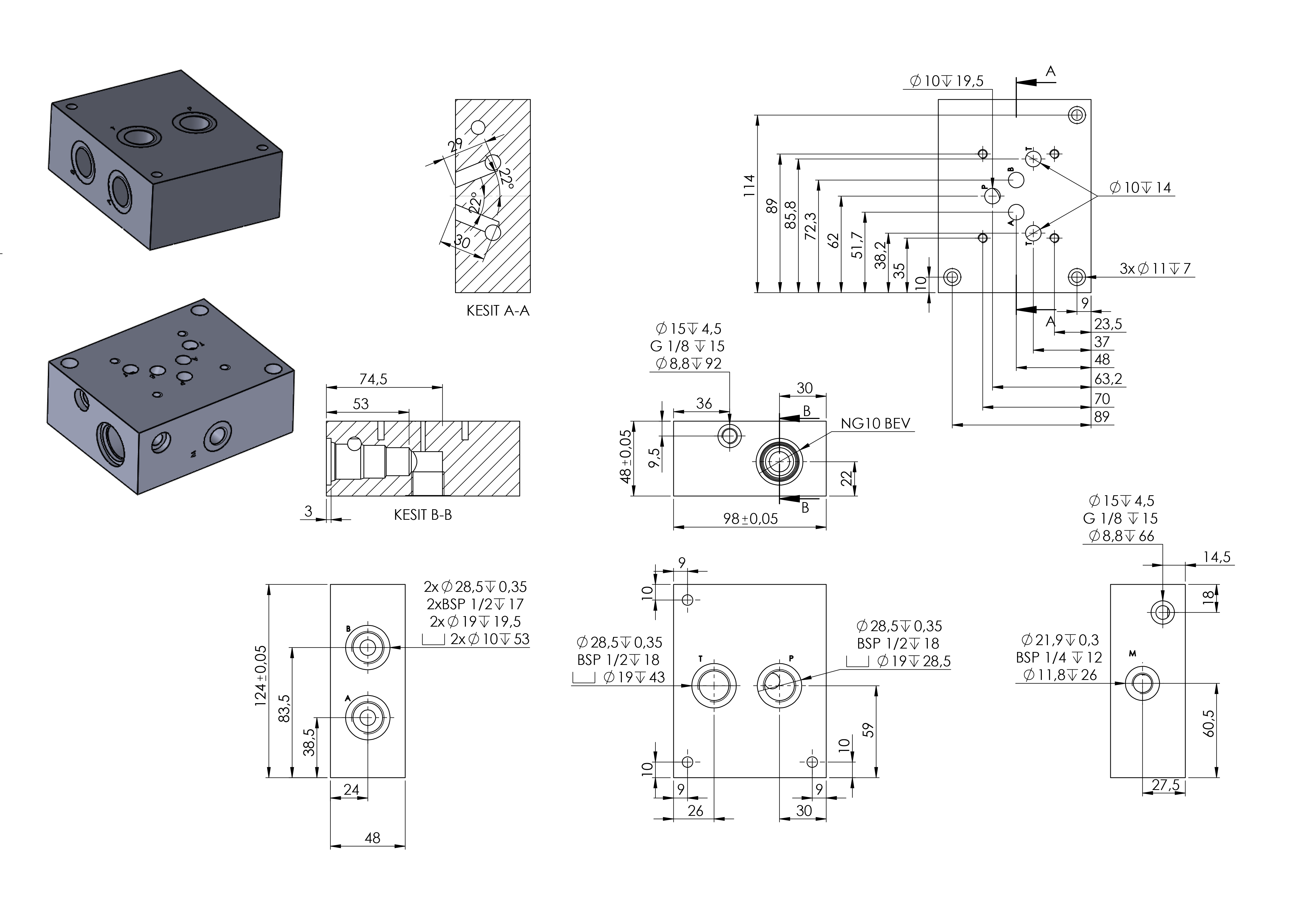 CETOP podnožje NG10-RV je nadgrajena izvedba standardnega NG10 (CETOP 5 / ISO 4401-05) podnožja, ki ima vgrajen varnostni ventil. Namenjeno je zaščiti hidravličnega sistema pred previsokim tlakom ter zagotavlja varno in zanesljivo delovanje.
